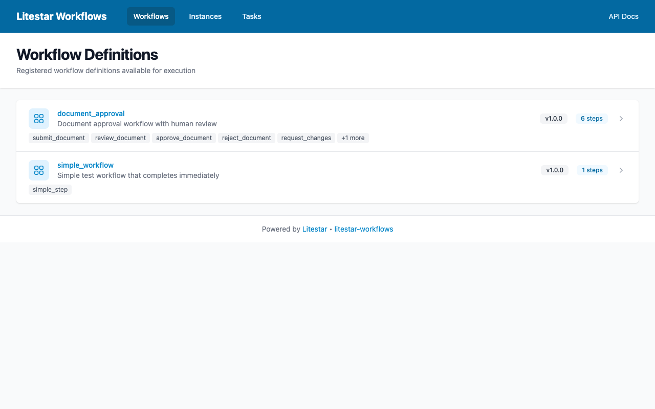 That’s it! Your application now has workflow API routes at /workflows/*.